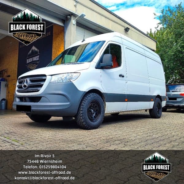 Die 255/70R16 All-Terrain Offroadbereifung für den Mercedes-Benz Sprinter W907 Heckantrieb ab Baujahr 2018 ersetzt die serienmäßige 235/65R16 Bereifung und sorgt für eine echte Höherlegung des gesamten Fahrzeugs um ca. +26 mm, inklusive Heck-Differenzial.